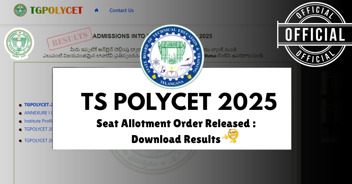 తెలంగాణ పాలీస్ఎట్ 2025 యొక్క మొదటి విడత సీట్ అలాట్మెంట్ ఫలితాలు జూలై 4, 2025న విడుదల చేయబడినాయి. మొదటి విడత కౌన్సెలింగ్కు ఆన్లైన్లో దరఖాస్తు చేసిన విద్యార్థులు వారి సీట్ అలాట్మెంట్ వివరాలను అధికారిక వెబ్సైట్ https://tgpolycet.nic.in/ నకు వెళ్లి డౌన్లోడ్ చేసుకోవచ్చు. సీట్ అలాట్మెంట్ ఫలితాలను ఎలా డౌన్లోడ్ చేసుకోవాలో పూర్తి వివరాలను ఈ ఆర్టికల్ ద్వారా చూసి తెలుసుకుందాం.