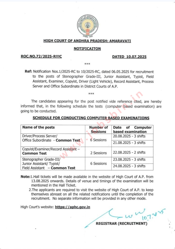 10-07-2025 న ఆంధ్రప్రదేశ్ హైకోర్టు పరీక్ష తేదీలను అధికారికంగా ప్రకటించింది. ఈ పరీక్షలను కంప్యూటర్ ఆధారిత పరీక్ష (CBT) రూపంలో నిర్వహించనున్నారు.