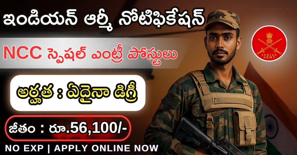 ఇండియన్ ఆర్మీ మరోసారి ఉద్యోగార్థులకు అద్భుతమైన అవకాశాన్ని అందిస్తోంది. NCC క్యాడెట్ల కోసం స్పెషల్ ఎంట్రీ స్కీమ్ – 2025 ద్వారా మొత్తం 76 పోస్టులు భర్తీ చేయనున్నట్లు నోటిఫికేషన్ విడుదల చేసింది. ఈ రిక్రూట్మెంట్లో ఎంపికైన అభ్యర్థులు లెఫ్టినెంట్ హోదాతో గౌరవప్రదమైన సేవ చేసే అవకాశం పొందుతారు. దరఖాస్తులు 2025 ఆగస్టు 11 నుండి సెప్టెంబర్ 10 వరకు ఆన్లైన్లో స్వీకరించబడతాయి.