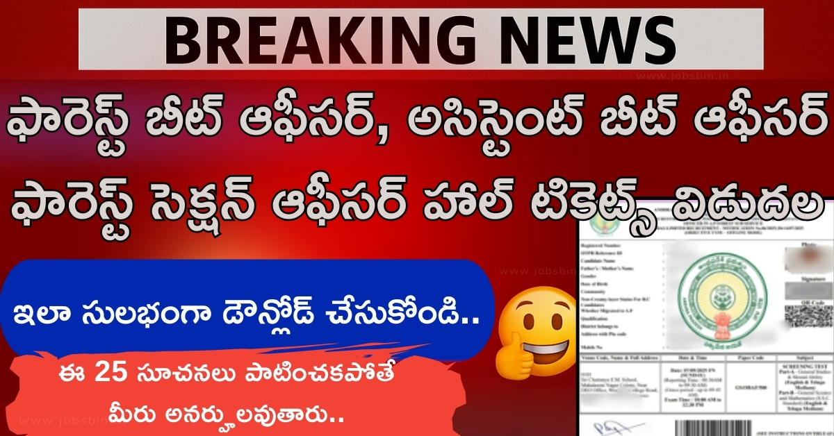 APPSC నుండి విడుదలైన ఈ అటవీ శాఖ పరీక్షలు, ముఖ్యంగా FBO, ABO, FSO ఉద్యోగాలు కోసం ఆసక్తిగా ఎదురుచూస్తున్న అభ్యర్థులకు కీలకమైనవి. హాల్ టికెట్లు ఇప్పటికే అందుబాటులో ఉన్నందున, ప్రతి అభ్యర్థి వీలైనంత త్వరగా వాటిని డౌన్లోడ్ చేసుకుని, పరీక్షకు సన్నద్ధం కావాలి.