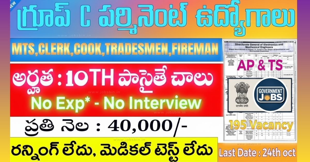 ఆర్మీ ఉద్యోగాల కోసం ఎదురుచూస్తున్న అభ్యర్థులకు ఇది ఒక సువర్ణావకాశం. 🏆 ఇండియన్ ఆర్మీ Directorate General of Electronic and Mechanical Engineers (DG EME) విభాగం నుంచి గ్రూప్ C పోస్టుల కోసం మొత్తం 194 ఖాళీలు విడుదలయ్యాయి. దేశవ్యాప్తంగా ఉన్న అర్హులైన అభ్యర్థులు ఈ పోస్టులకు ఆన్లైన్లో దరఖాస్తు చేసుకోవచ్చు.