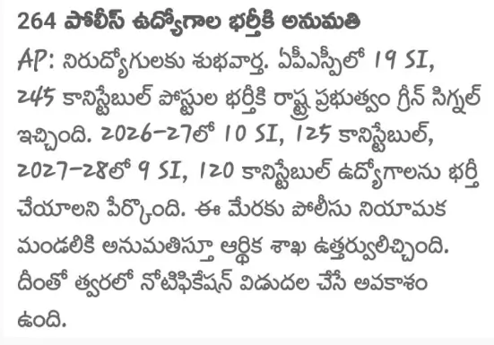 ఆంధ్రప్రదేశ్ పోలీస్ విభాగం మొత్తం 264 పోస్టులు ప్రకటించనుంది.